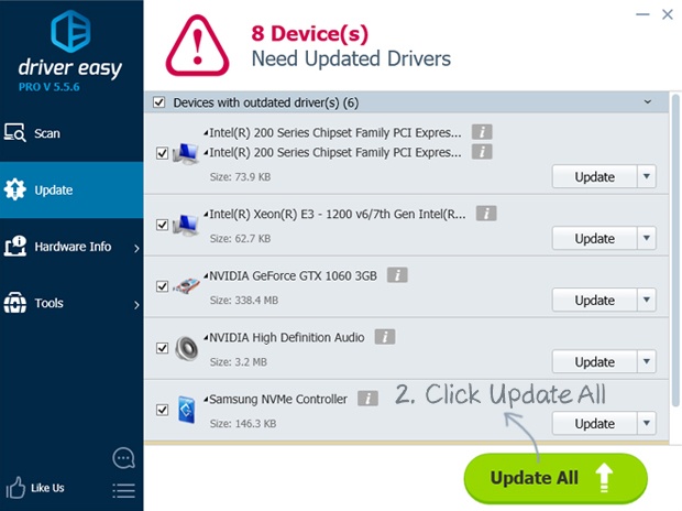 Driver Easy lists all the drivers you need. Click Update All to download and install new drivers automatically. (Or update each driver individually.)